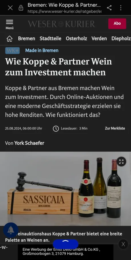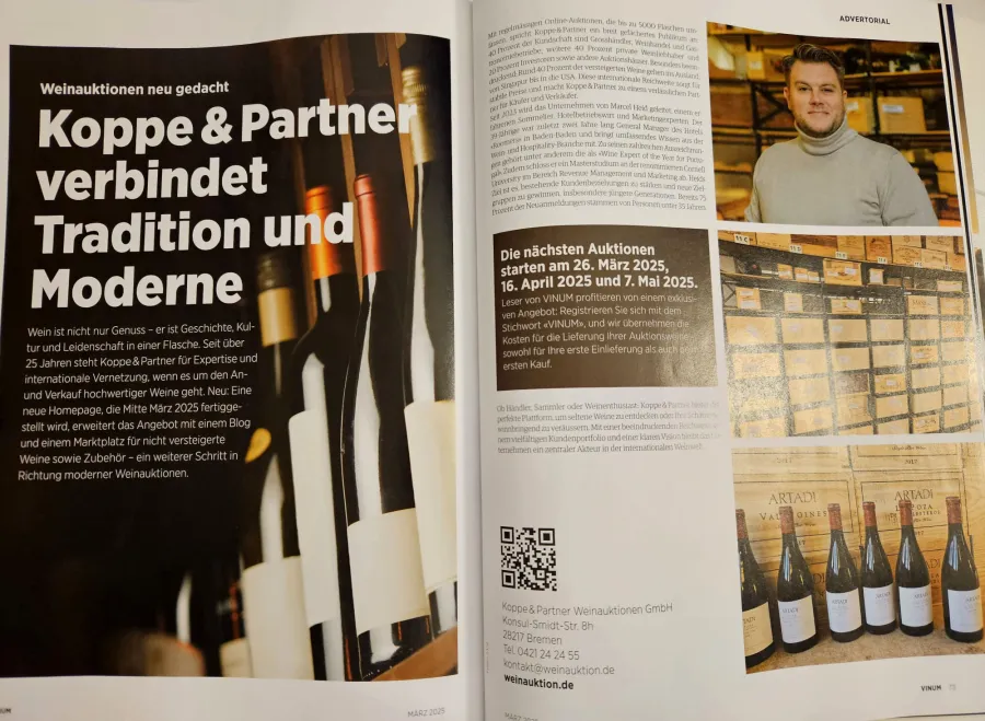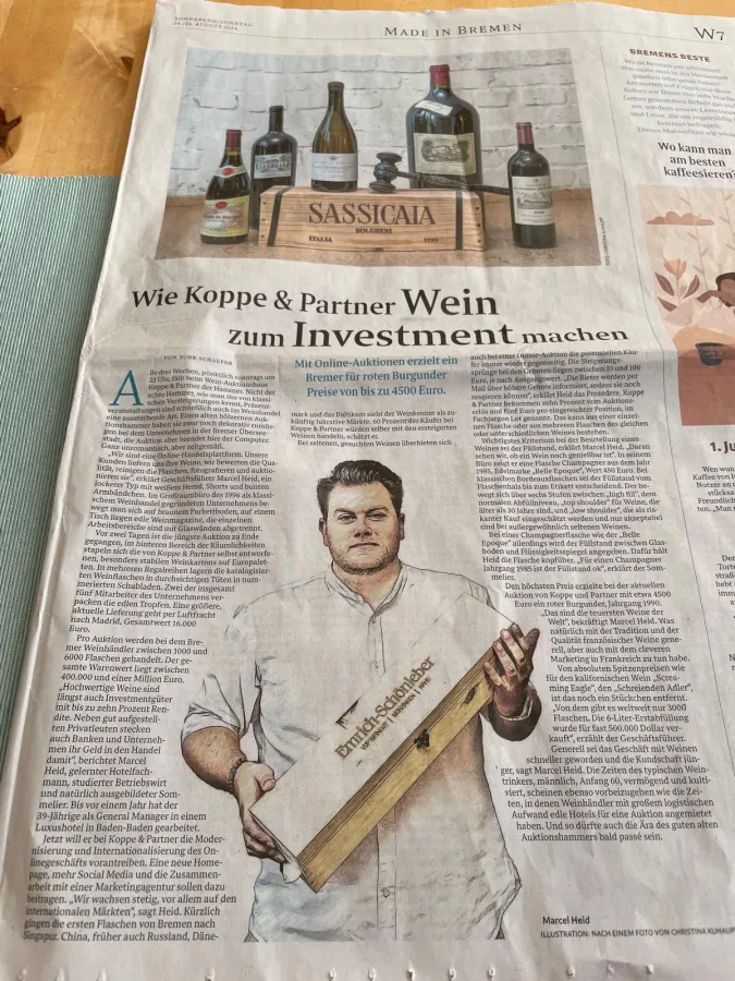 Als erstes deutsches Weinauktionshaus ist Koppe & Partner Ihr erfahrener Spezialist, wenn es um Weinversteigerungen geht. Eine Weinauktion ist der magische Ort für Genießer mit Gespür für Werte, Geschichte und Sammelleidenschaft. Denn ein besonderer Wein ist nicht nur die Krönung einzigartiger Momente, sondern empfiehlt sich auch als edles Geschenk für Kenner oder als Wertanlage.